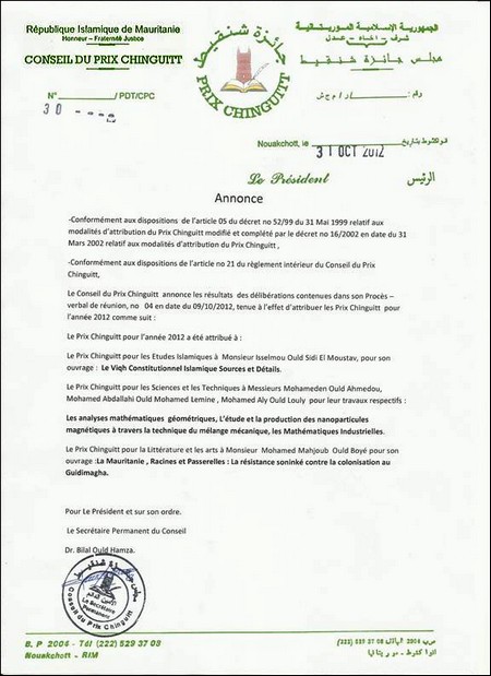 Le directeur de ce conseil, Belal Ould Hamza, a annoncé les noms des lauréats 2012 le 31 octobre. Mohamedna Ould Ahmed, Mohamed Abdalla Ould Mohamed Lamine et Mohammed Ali Ould Louli ont remporté le prix en sciences et technologie, Mohamed al-Mahjoub Ould Bayyah s'est distingué dans la catégorie littérature, et Islam Ould Sidi al-Moustafa a été désigné lauréat du prix d'études islamiques.