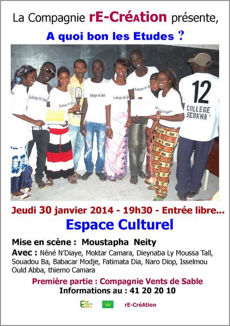 Voilà quelques réflexions sur l’éducation de nos enfants amenées aujourd’hui par les jeunes mauritaniens. La compagnie rE-créAtion et l’Espace Culturel vous invitent à réfléchir ensemble sur ces questions dans la pièce théâtrale intitulée : A quoi bon les études ?