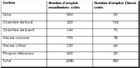 Et comme le voulait alors, le protocole de la convention, les chinois avaient obtenu un accès aux ressources céphélopodières (5 anvires au moins). Dans sa rencontre avec les citoyens, il y a deux ans, le président de la République assurait, à Atar en août 2012, qu'en raison de l'importance des emplois créés, la convention s'était imposée. Or, malheureusement, sur les 2080 emplois prévus (voir tableau) à la faveur de la signature de cette convention, il y en a à peine aujourd'hui -trois ans après- mois de 700.