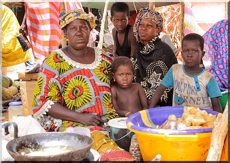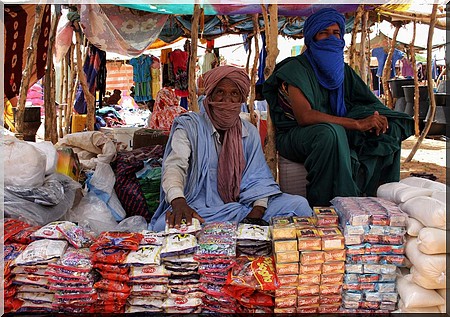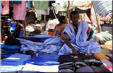 Khalifa Ould Mohamed Lemine, assis avec son fils à moins de 10 mètres de l'érudit, opine totalement en son sens. D'abord un peu frustré d'être dérangé dans sa conversation passionnée avec une commerçante voisine bambara, en Bambara, il est encouragé par Moulaye Ely Ould Zeïn à réagir : "Comme vous voyez, je vends divers produits alimentaires, essentiellement des sucreries et biscuits pour les enfants. J'ai 9 enfants, et vous comprenez facilement que l'aide humanitaire ne peut pas me permettre de m'occuper pleinement de ma famille. Ce marché me permet dans une certaine mesure de compléter nos besoins" dit en hassanya, le patriarche originaire de Taoudenni, avant de congédier rapidement en Songhaï un petit garçon qui commençait à déranger l'ordre de sa marchandise étalée.