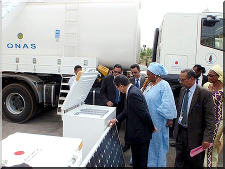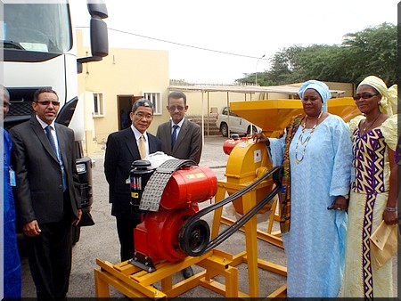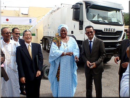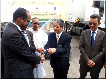 Ambassade du Japon- S.E.M. Jun Yoshida, Ambassadeur du Japon en Mauritanie et Mme. Coumba Mar Gadio, Représentant Résident du PNUD Mauritanie, ont remis aujourd’hui à M. Yahya Ould Abdedayem, Directeur Général des Politiques Economiques et Stratégies (Ministère des Affaires Economiques et du Développement) et M. Hamzette Ould Amar, Directeur Général de l'Office National pour l’Assainissement (Ministère de l’Hydraulique et de l’Assainissement), un important lot de matériel comprenant une hydro cureuse et des intrants agricoles et des équipements de travail destinés aux communautés vulnérables dans le cadre des efforts visant la réduction des risques liés aux catastrophes.