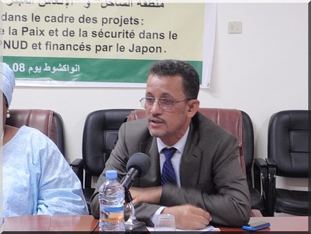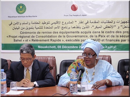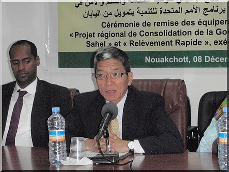 Je suis ravi de prendre part à cette cérémonie de remise d'équipements dans le cadre des projets financé par le Gouvernement du Japon et mis en œuvre par le PNUD. Le Gouvernement du Japon finances à hauteur de 4,5 milliards d'ouguiyas, soit 1,5 million de dollar américain, pour le projet de «Consolidation de la Paix et du Bonne Gouvernance au Sahel », qui a été signé en mars 2013, mené dans 5 pays de la région du Sahel, notamment Mali, Burkina Faso, Niger, Tchad et Mauritanie.
