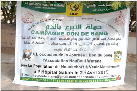 a permis de recueillir au total 50 poches qui vont servir à sauver la vie des malades nécessiteux. A travers son patriotisme, l'association Houboul watane continue dans ces œuvres à conscientiser tous les Mauritaniens sur la culture citoyenne et essayer d’atténuer la souffrance des plus vulnérables.