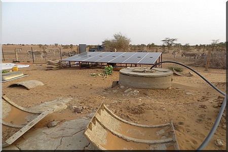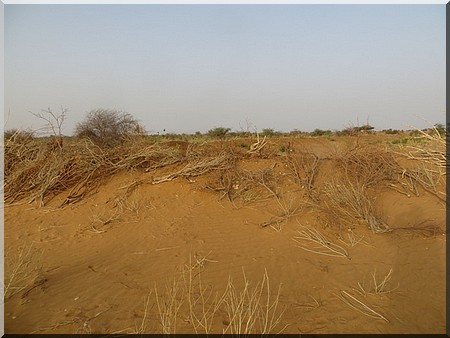 c’est ainsi que les ouvrages suivants on été réalisés : Une digue de retenue d’eau des pluies de 500m de long pour la mise en valeur de 50 ha de culture céréalières, un seuil de ralentissement de 400m de long, pour ralentir le ruissellement des eaux de pluie et pour maintenir une humidité suffisante pour 40 ha de culture agro-Forestière, une mise en défens de 200ha, le renforcement des capacités organisationnelles de la communauté, la remise en état des locaux communautaires et d’un véhicule de liaison, la plantation d’une haie vive de 24000 m linéaires en euphorbe pour servir de brise vent pour protéger les cultures, le clayonnage et fixation de 20 ha de terre dégradée par l’ensablement, la mise en place d’une pépinière de 4000 plants d’arbres , la réalisation d’une étude géophysique pour l’implantation de 2 forages , le fonçage de 2 puits en béton et la réalisation d’un forage de 80m de profondeur équipé en pompe immergée et panneaux solaires avec accessoires, et 2 citernes en bâche avec accessoires pour l’alimentation en eau des populations et des animaux.
