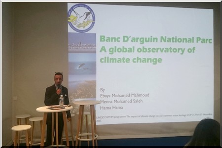 Il faut rappeler que la Délégation Mauritanienne a également assisté le 05 Décembre 2015 à un Side Event organisé par l’UNESCO et au cours duquel les représentants du Parc National du Banc d’Arguin a présenté une importante communication intitulée « Le PNBA, un observatoire planétaire pour le Changement Climatique» eu égard à sa genèse, aux inondations des villages, des îles et ilots, l’érosion côtière, le changement du trait de côte etc.).