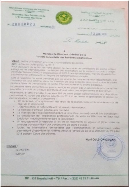 Au moment où des individus circulent avec des autorisations de pêcher 5 000 tonnes de céphalopodes (voir fac-similé), soit une flotte de 40 bateaux, que peuvent bien penser les opérateurs du secteur qu’on veut étouffer par tous les moyens ?