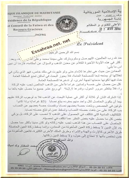 Essahraa - Le haut conseil mauritanien de la fatwa et des recours gracieux a émis un jugement sur la légalité de la prospection de l'or, signé mercredi 27 avril courant par son président Mohamed Moctar Ould M’Balla.