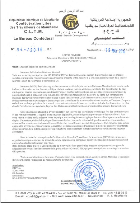 Suite aux mesures graves prises par Kinross Tasiast de Limited le cout de la main d’œuvre ainsi que les charges sociales, je n’ai pu me résigner sans vous adresser la présente lettre, relative à la situation sociale au sein de la société Kinross Tasiast de Mauritanie d’extraction d’Or.