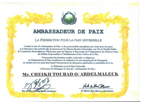 Atlasinfo - La Fédération pour la Paix Universelle, dont le siège est à Paris, vient d’élever monsieur Cheikh Tourad Ould Abel Malick, le Commissaire aux Droits de l’Homme et à l’Action Humanitaire, au titre d’Ambassadeur de Paix dans le monde.