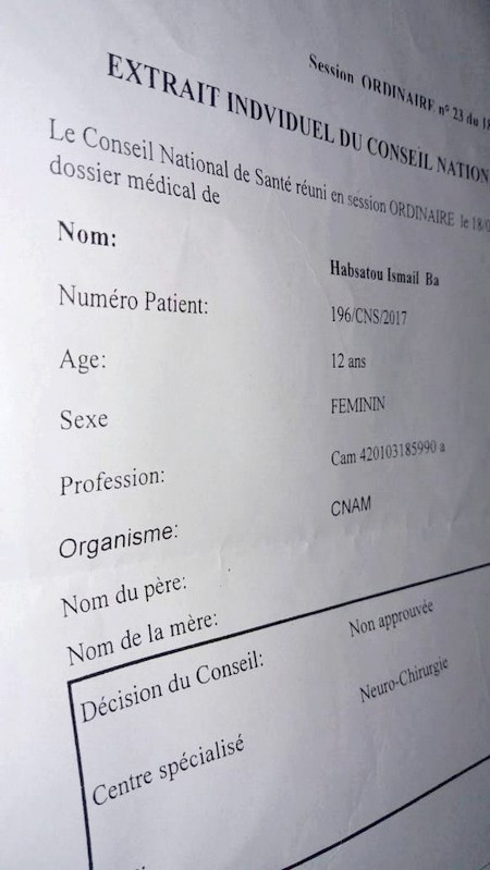 Nation Info - La petite Habsatou Ismail Ba, 12 ans est atteinte d’une scoliose dorsale qui l’empêche d’aller à l’école et de mener normalement ses activités. Admise à l’hôpital, le Conseil national de la santé ordonne immédiatement son évacuation au Maroc.