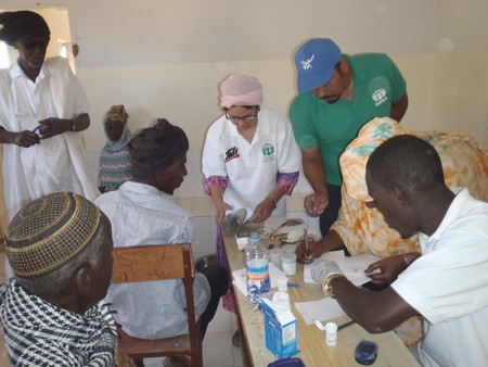 Place aux consultations d’adultes, de personnes âgées et d’enfants. L’équipe médicale est assistée par les jeunes garçons et filles de l’association des jeunes de Bakaw qui ont déployé toutes leurs énergies du début jusqu’à la fin de la caravane de santé mobile. Vérification de la tension des patients, prises de sang, déparasitages des enfants et plus impressionnant, c’est l’alignement de nombreuses assiettes remplies d’eau mélangée à un produit pharmaceutique où la plupart des patients, des personnes âgées essentiellement y trempent leurs pieds au bout de 15 minutes.