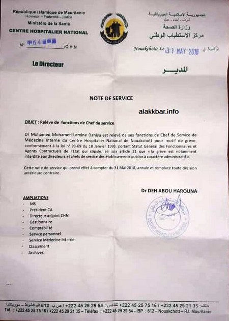 Le directeur général du Centre hospitalier national a limogé de son poste de chef du département "médecine interne", Docteur Mohamed Ould Mohamed Lemine, surnommé Dahya, président du syndicat des médecins spécialistes.