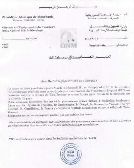 11-09-2018 20:42 - Mauritanie : l’Office National de la Météo met en garde contre des inondations (fac-similé)