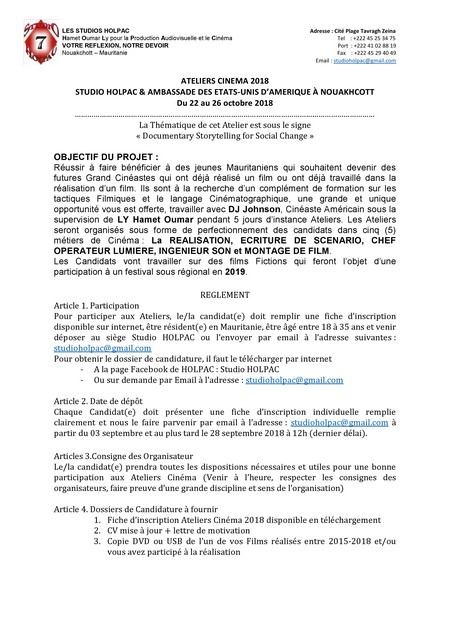 Studio HOLPAC - Studio HOLPAC, et son Partenaire l’Ambassade des Etats-Unis à Nouakchott organisent des Ateliers Cinéma pour faire bénéficier à des jeunes Mauritaniens qui souhaitent devenir de futures Grands Cinéastes qui ont déjà réalisé un film ou ont déjà travaillé dans la réalisation d’un film.