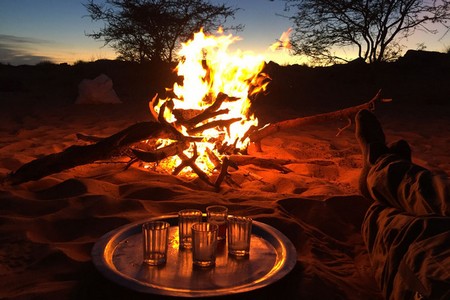 Pendant notre journée de marche, nous croisons un troupeau de chèvres avec ses bergers. Notre guide, Salem, nous fait la surprise d’en acheter une. Ce sera notre menu du soir, avec en apéritif, son foie et ses intestins. Après une seconde d’hésitation, je me décide à y gouter et à ma surprise, c’est vraiment bon les intestins. Salem nous prépare aussi comme chaque soir le pain cuit dans le sable que l’on mange au petit déjeuner et il est vraiment bon.