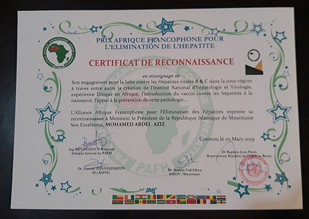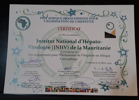 Institut National d'Hépato-Virologie - Dans le cadre de son 1er Congrès tenu à Cotonou au Bénin, du 03 au 05 mars, l’Alliance Africaine Francophone de lutte contre l’Hépatite a exprimé sa reconnaissance au Président de la République Islamique de Mauritanie,