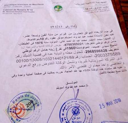 Après de vaines tentatives de se faire payer, son créancier, Mohamed Moktar Mohamed Abdallahi Ahmed Ghaly en a donné procuration numéro 1213/2019 en date du 25 Mars dûment délivrée par le cabinet du notaire Me Mohamed Abdallahi Ould Soueilim à Cheikh Ould Hmeimed qui préfère se faire payer calmement sans être obligé d'entreprendre d'autres voies pour recouvrer ses droits.