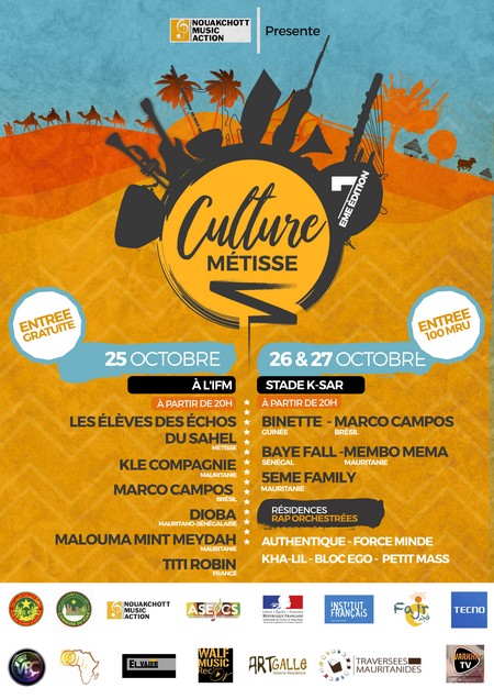 L’ouverture officielle de cette 7eme édition Festival Culture Métisse est prévue ce mercredi 23 octobre et sera marquée par une conférence qui sera anime par des jeunes leaders acteur du développement autour d’un thème d’actualité « L’avancée des TIC et son influence dans la musique » au niveau des échos du sahel, une exposition & show case des artistes Mauritaniens, juste après la date du 24 Octobre à Art Gallé une deuxième conférence avec le thème « Voyez vous l’Art comme un monde d’Homme ? » avec nos femmes artistes qui sont dans le milieu : Peintres, photographes, Stylistes, Musiciennes pour parler de leur parcours et partage d’expérience.