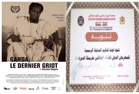 Ousmane Diagana a reçu ce prix lors de la clôture de la 11ème édition du Festival international du film documentaire de Khouribga. Le film « Ganda, le dernier griot » reçoit ainsi sa première distinction. Le film a participé à de nombreuses compétitions dont le pestigieux FESPACO où il a été, lors de sa dernière édition, sélectionné parmi 21 films dans la catégorie "Documentaire long métrage" par le comité de sélection.