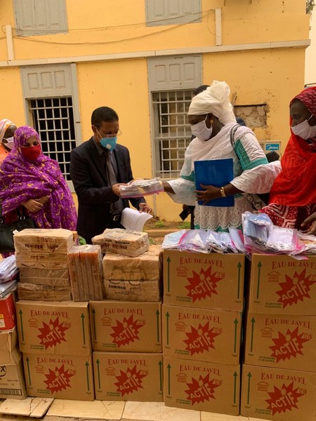 Le don est composé des lots de masques en tissu lavable et réutilisables confectionnés par des tailleurs mauritaniens, du savon et de l’eau de javel.
