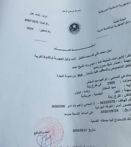 Mourassiloun a obtenu une convocation de l’intéressé à assister à la séance judiciaire du 24/9/2020 concernant le chèque sans provision.