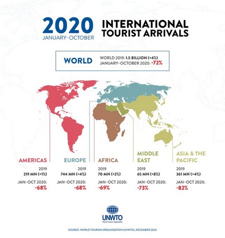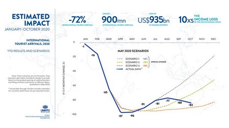 Cette situation se traduit par une perte de 935 milliards $ de recettes d'exportation du tourisme international à fin octobre 2020, « soit plus de dix fois la perte enregistrée en 2009 sous l'impact de la crise économique mondiale».