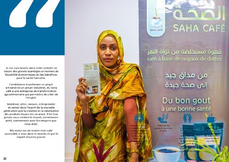 Inspirée par sa grande mère qui grillait les noyaux de dattes et les mélangeait avec du lait pour en faire une tisane, Teslem Mint Meissa de la Mauritanie, âgée de 23 ans, se lance dans la fabrication de « café » à base de noyaux de dattes. SAHA CAFE, comme nommé, est le produit issu de trois années de recherche sur comment produire du café à base de noyaux de dattes.