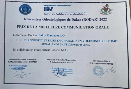 La communication orale de docteur Baïdy Mamadou Lô avait pour titre « Diagnostic et prise en charge d’un volumineux lipome jugal évoluant depuis 8 ans ».