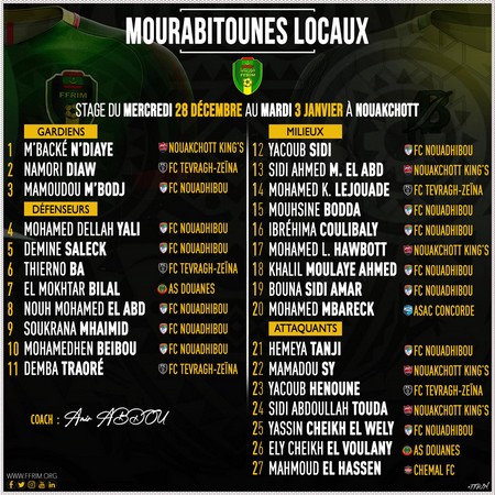 RIM Sport - Le sélectionneur national, M. Amir Abdou a communiqué ,mardi 27 décembre, La liste des 27 Mourabitounes locaux convoqués pour un stage à Nouakchott du mercredi 28 décembre au mardi 3 janvier.
