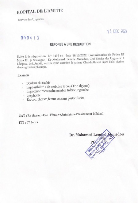 Des policiers, qui semblaient avoir comme unique cible ma personne, m'ont attaqué sans raison apparente et, après m'avoir frappé avec une extrême violence au visage, ainsi qu'au ventre, ont fini par s'enfuir et disparaître m'abandonnant dans une situation extrêmement malheureuse à l'hôpital de l'Amitié.