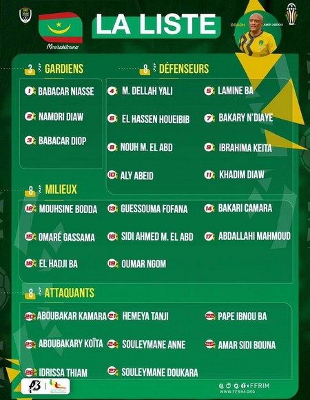 EN BREF | #Cridem - Amir Abdou, le sélectionneur de la Mauritanie, a dévoilé, ce lundi 25 décembre, la liste des 27 Mourabitounes qui s’envoleront pour la Coupe d’Afrique des nations en Côte d’Ivoire (13 janvier - 11 février). On y retrouve l’attaquant Aboubakar Kamara ou encore Hmeya Tanji.