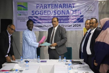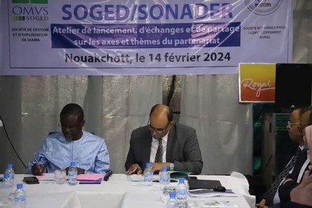 L'hôtel Royal Grill à Nouakchott a accueilli ce mercredi 14/02/2024 un atelier d'échange d'informations et d'expériences sur les axes de partenariat entre la Société Nationale pour le Développement Rural (SONADER) d'une part, et la Société de Gestion et d'Exploitation du Barrage de Diama (SOGED) d'autre part.