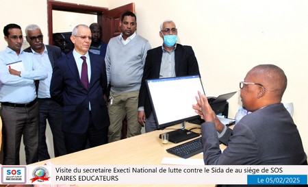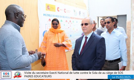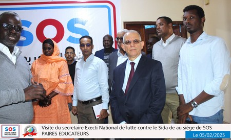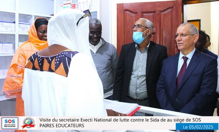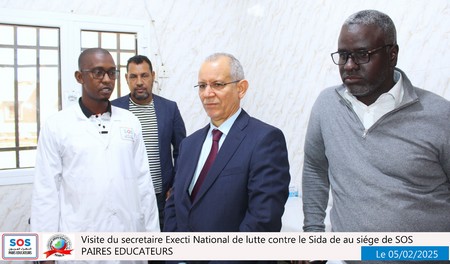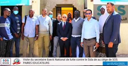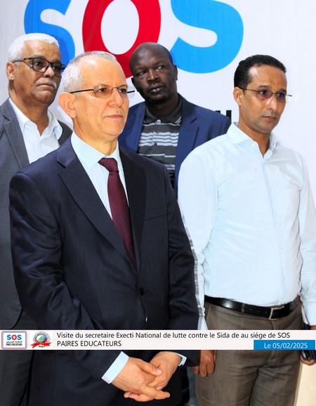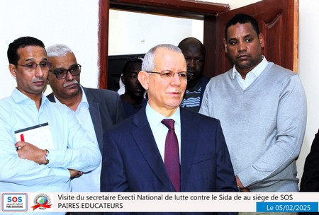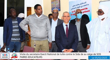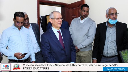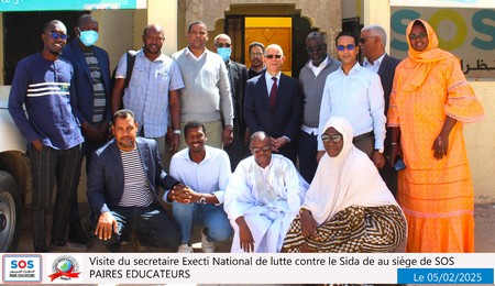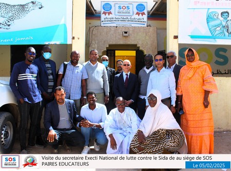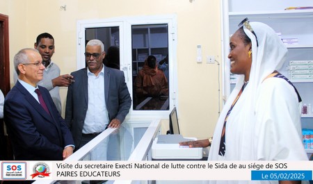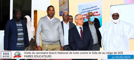 Nouakchott, le 5 février 2025 – Une délégation du SENLS présidée par le Secrétaire Exécutif National de Lutte Contre le Sida (SEN), Professeur Abdallahi Ould Sidi Aly, a effectué une visite au siège social de SOS Pairs Éducateurs (SOS PE), situé à El Mina, à côté du château d’eau.