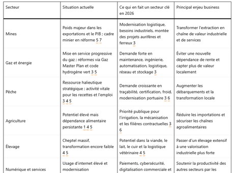 La Mauritanie de 2026 offre une image plus riche que celle d’un simple pays de minerais, de pêche et de gaz. Elle reste certes profondément structurée par ses ressources naturelles, mais elle entre dans une phase où l’enjeu principal est désormais la conversion de ces ressources en économie productive. Les secteurs clés — mines, gaz, pêche, agriculture, élevage, énergie, infrastructures et services numériques — ne doivent plus être analysés de manière isolée. Ils forment un système d’opportunités interdépendantes, dans lequel la logistique, l’électricité, l’eau, la formation, le financement et la gouvernance deviennent aussi importants que la ressource elle-même.